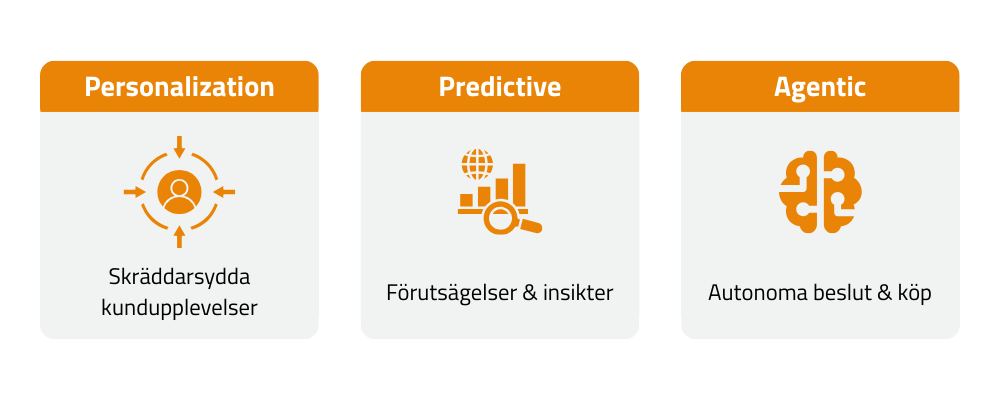 Än så länge används AI-agenterna främst i de tidiga delarna av köpprocessen (discovery och decision) men utvecklingen kommer knappast att stanna där. Shopifys VD Harvey Finkelstein berättade att antalet faktiska ordrar gjorda av en AI-Agent ökat 14 gånger hos dem under den senaste tolvmånadersperioden (delivery). Visserligen från låga nivåer, men ändå. Utvecklingen går från B-2-C till A-2-A (Agent-2-Agent) och det är ingen överdrift att tala om att shoppingupplevelsen på allvar börjar personaliseras.