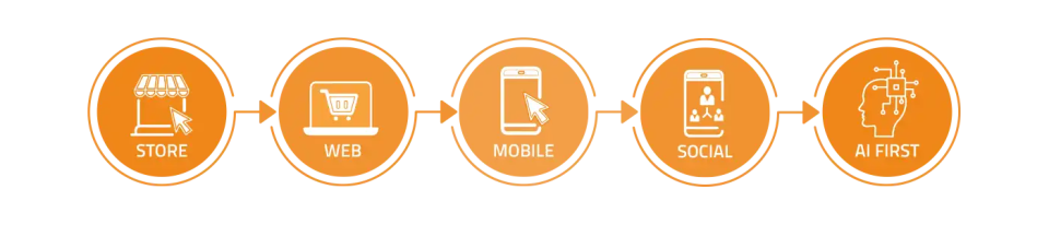 Detta är inte enbart en utveckling av dagens e-handel, utan ett paradigmskifte som flyttar gränser och förändrar styrkeförhållanden mellan aktörer inom retailbranschens ekosystem. Den historiska plattformsutvecklingen kan illustreras som på bilden nedan.